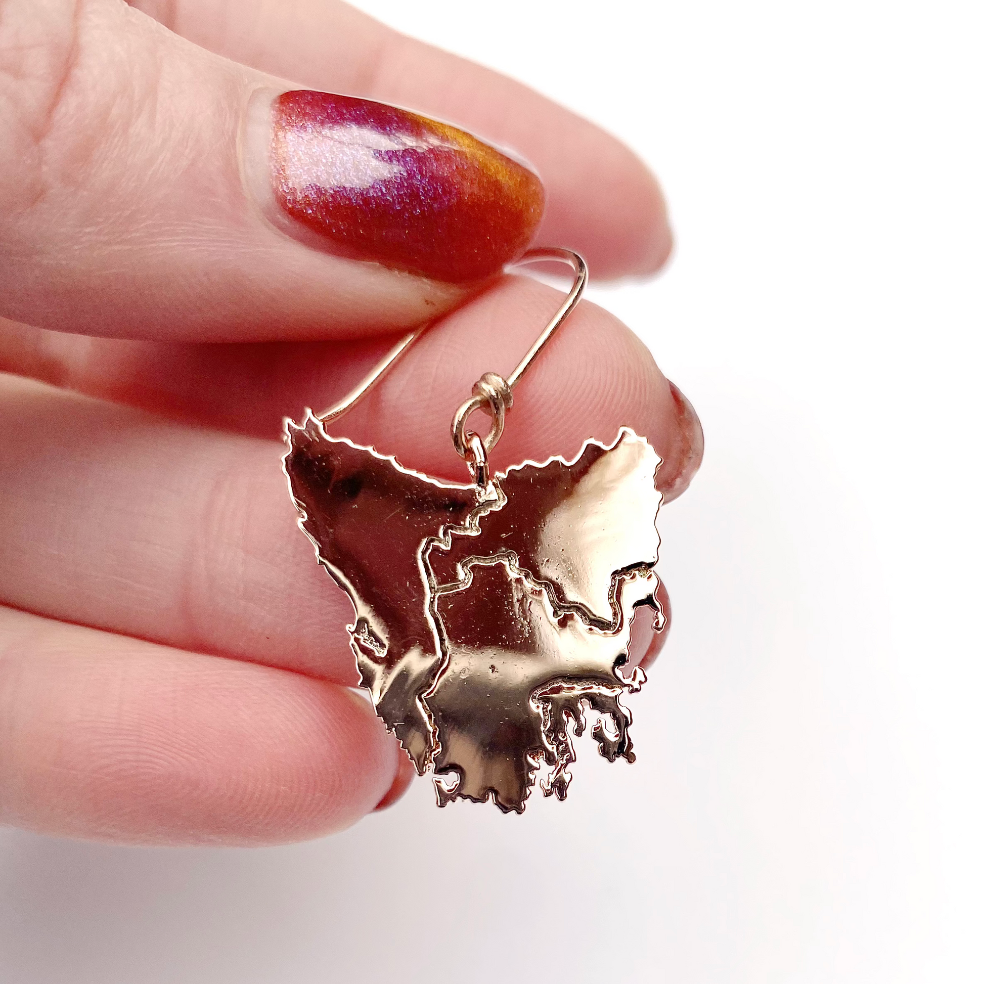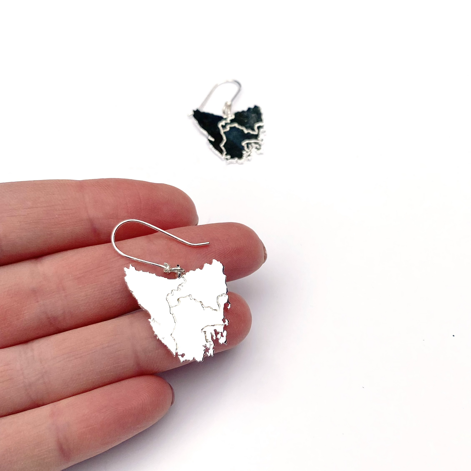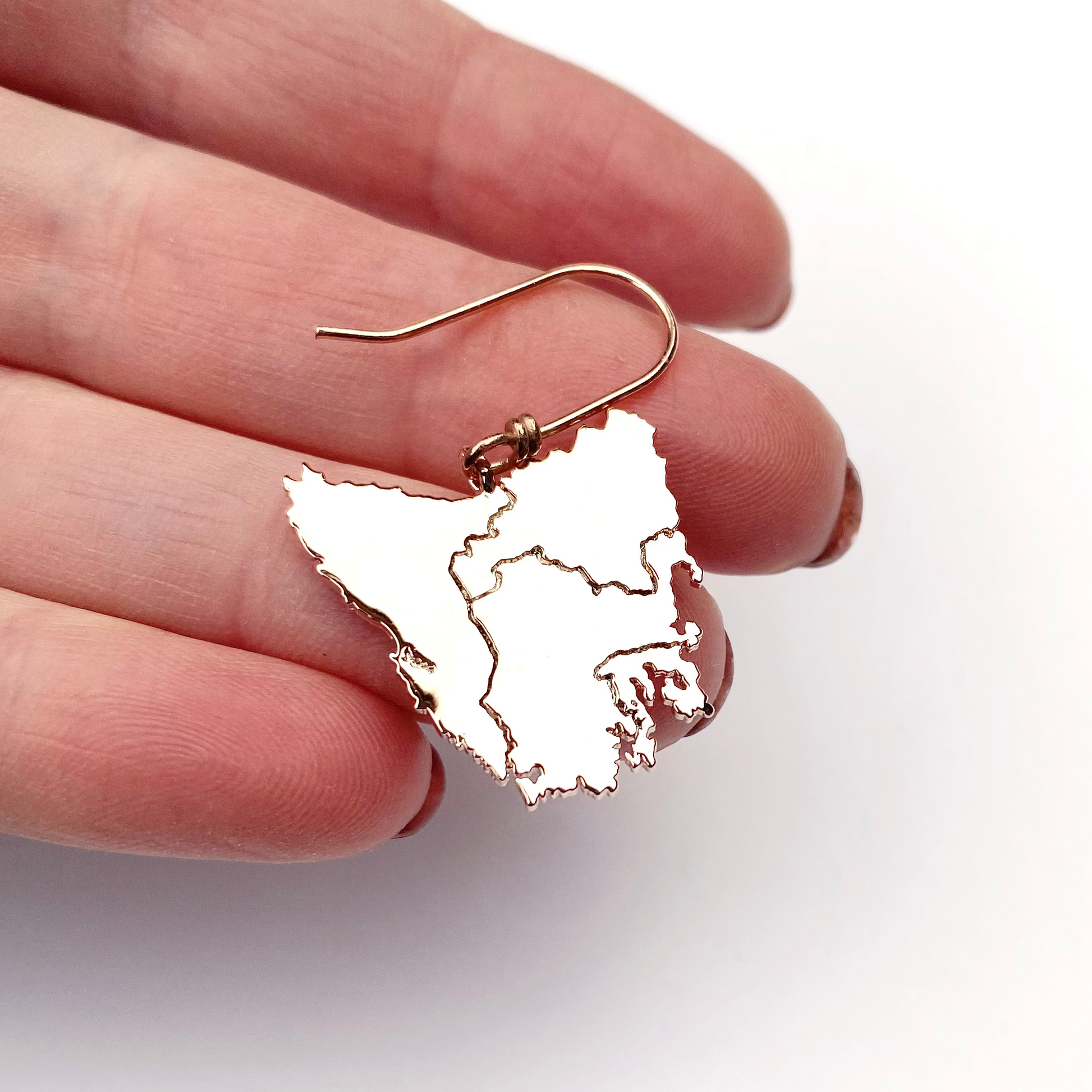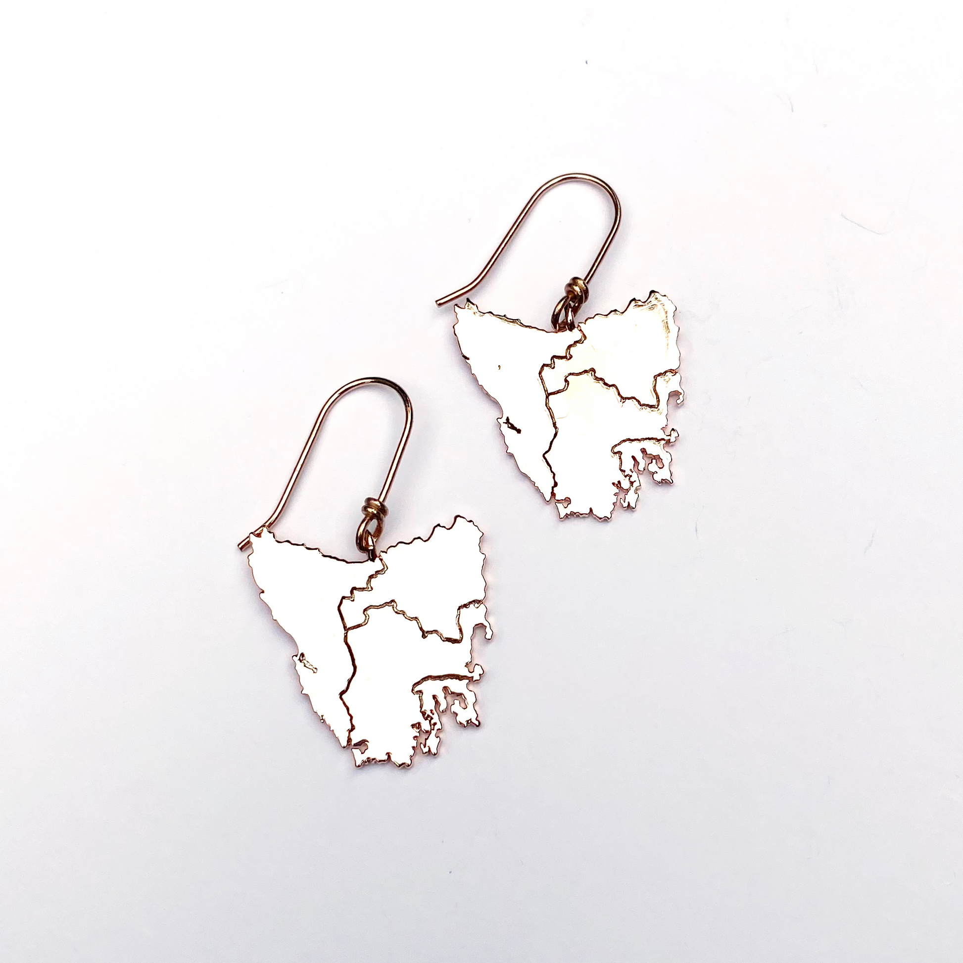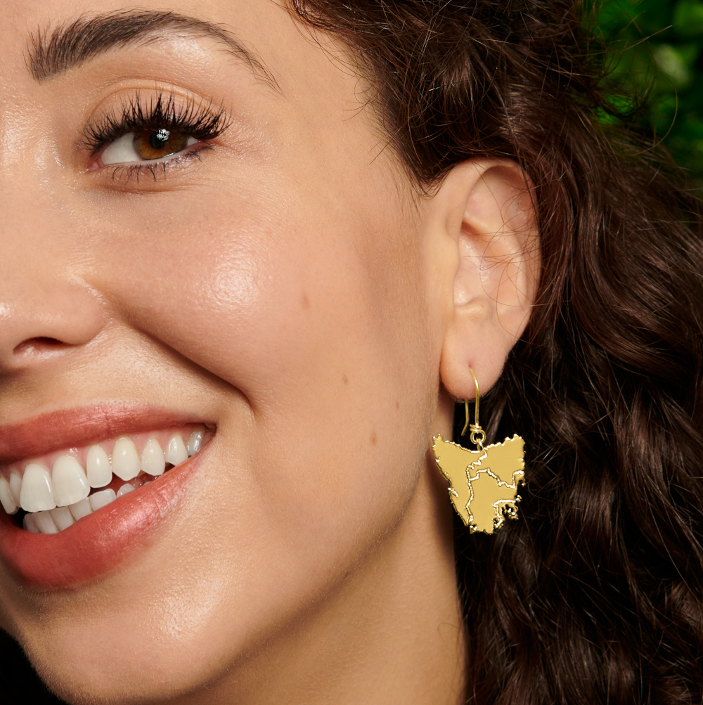 Tassie map inspired earrings in four beautiful metal plated options plus Stirling silver: