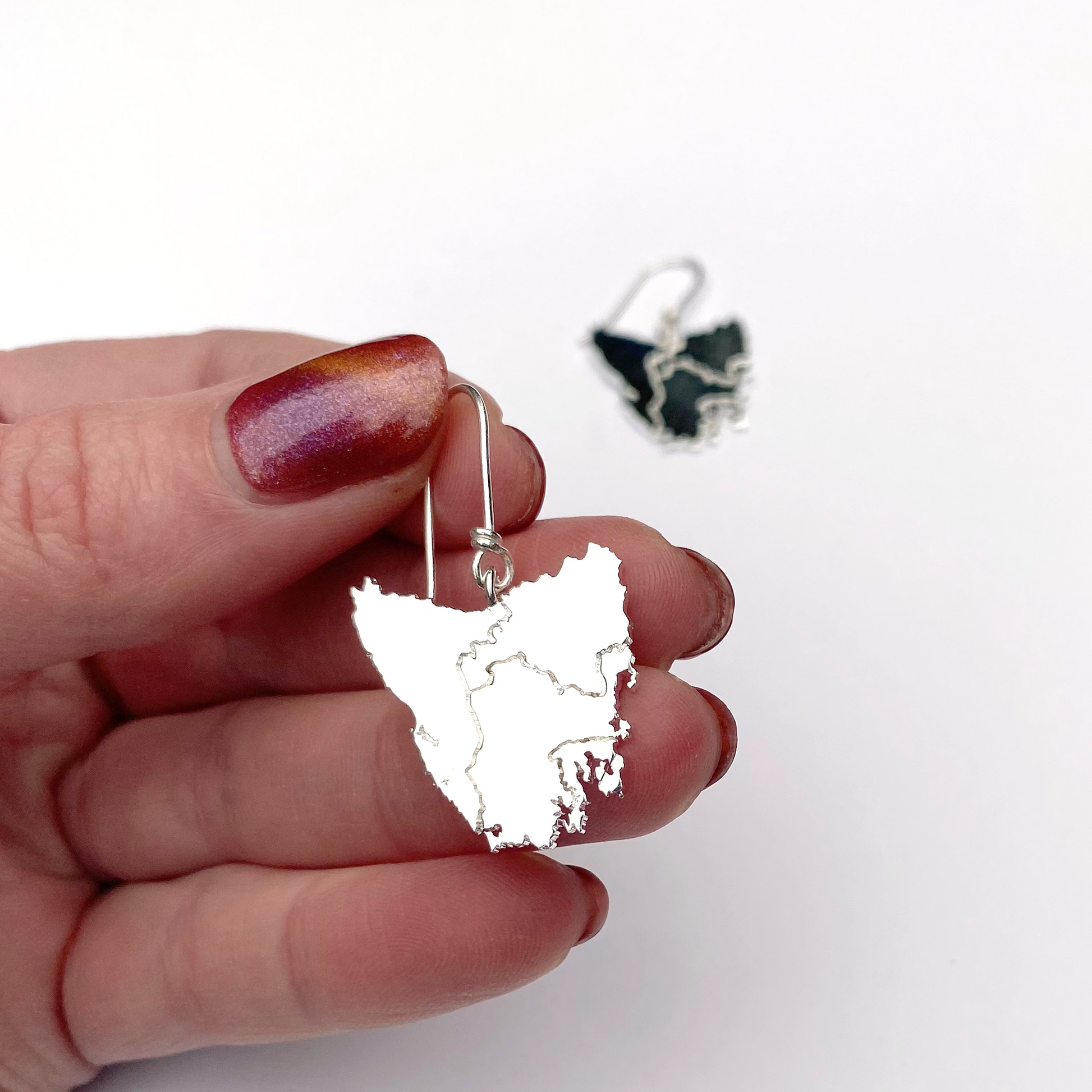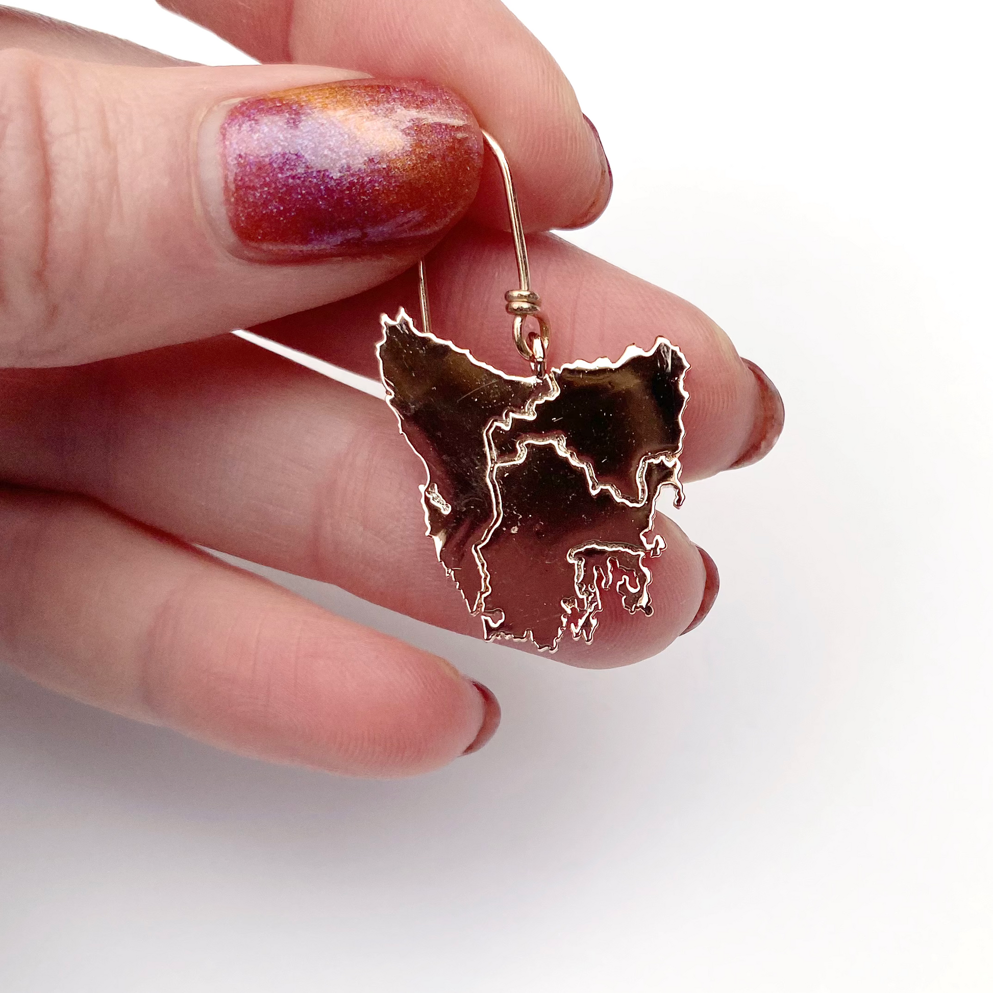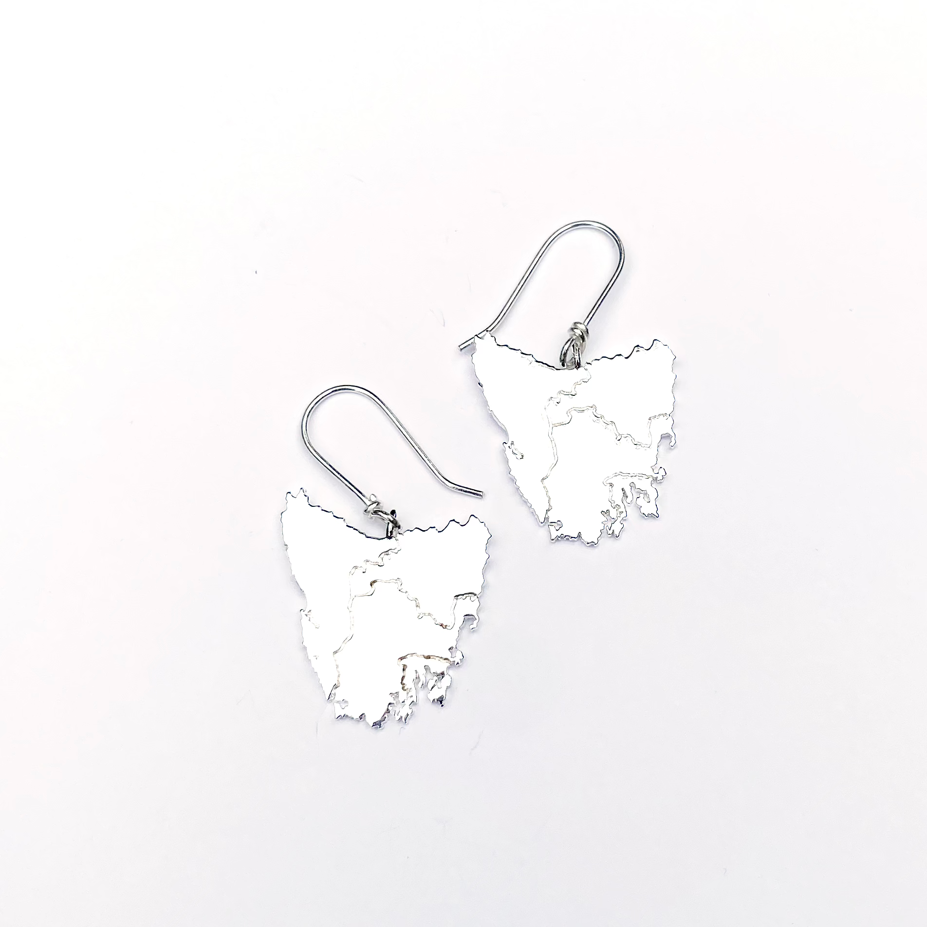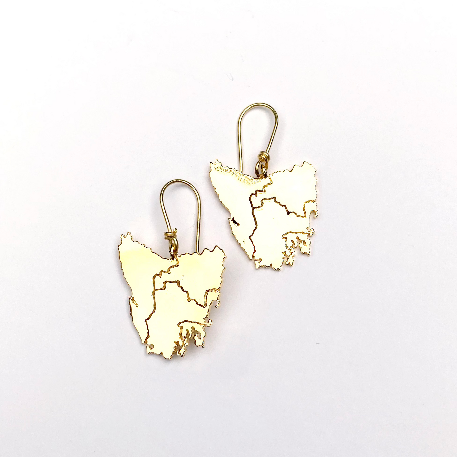 Tassie map inspired earrings in four beautiful metal plated options plus Stirling silver: