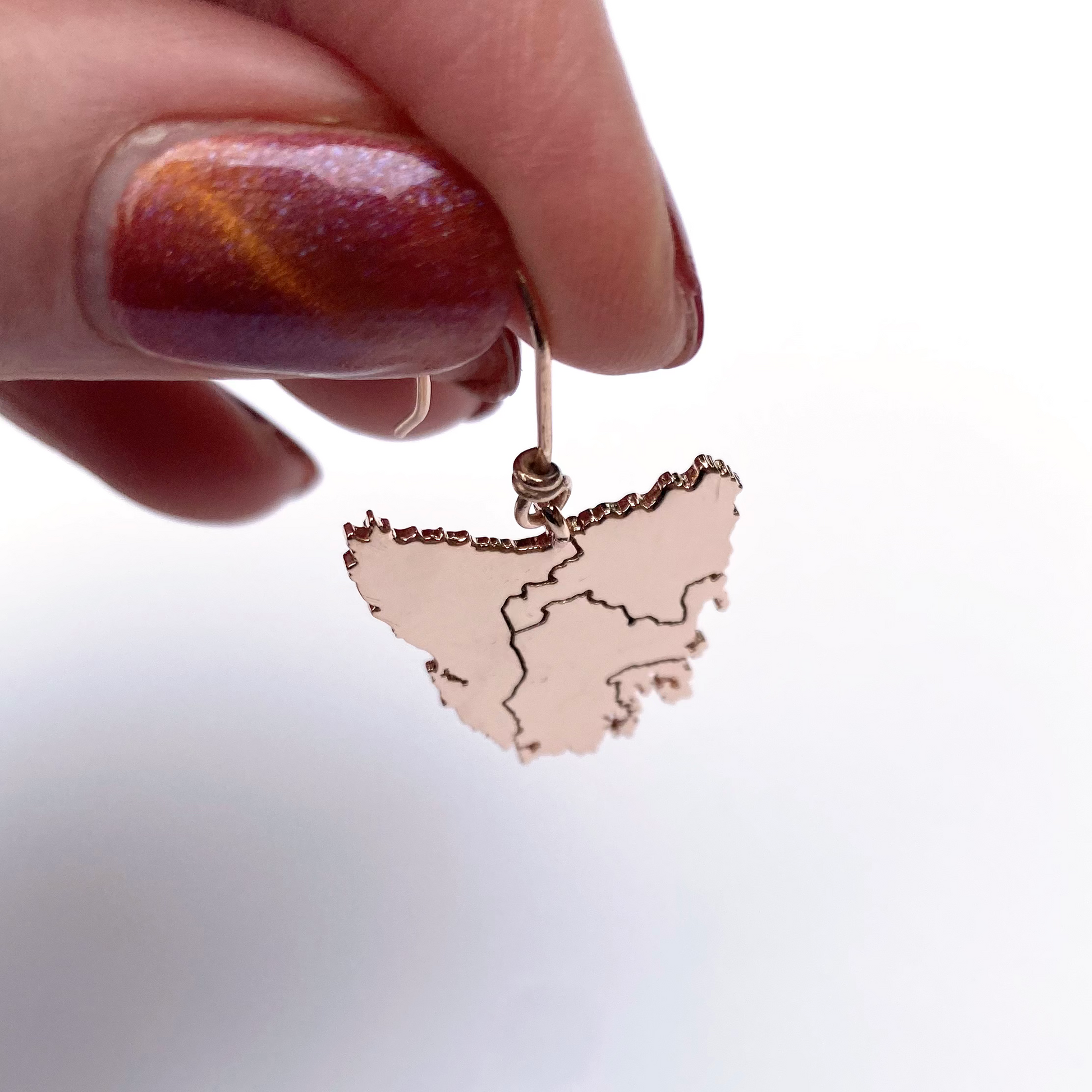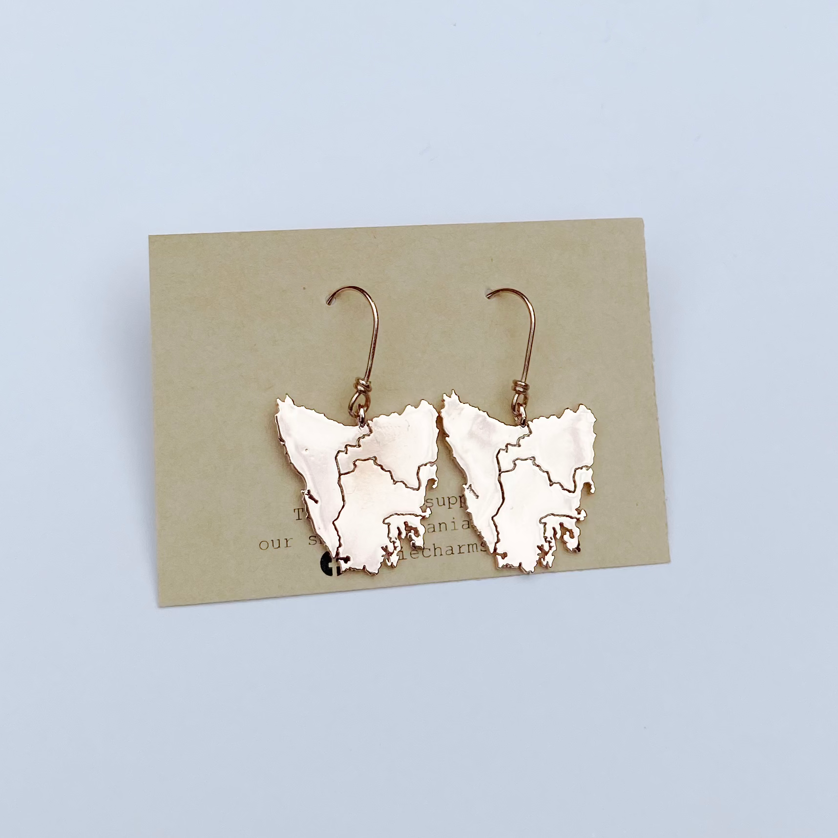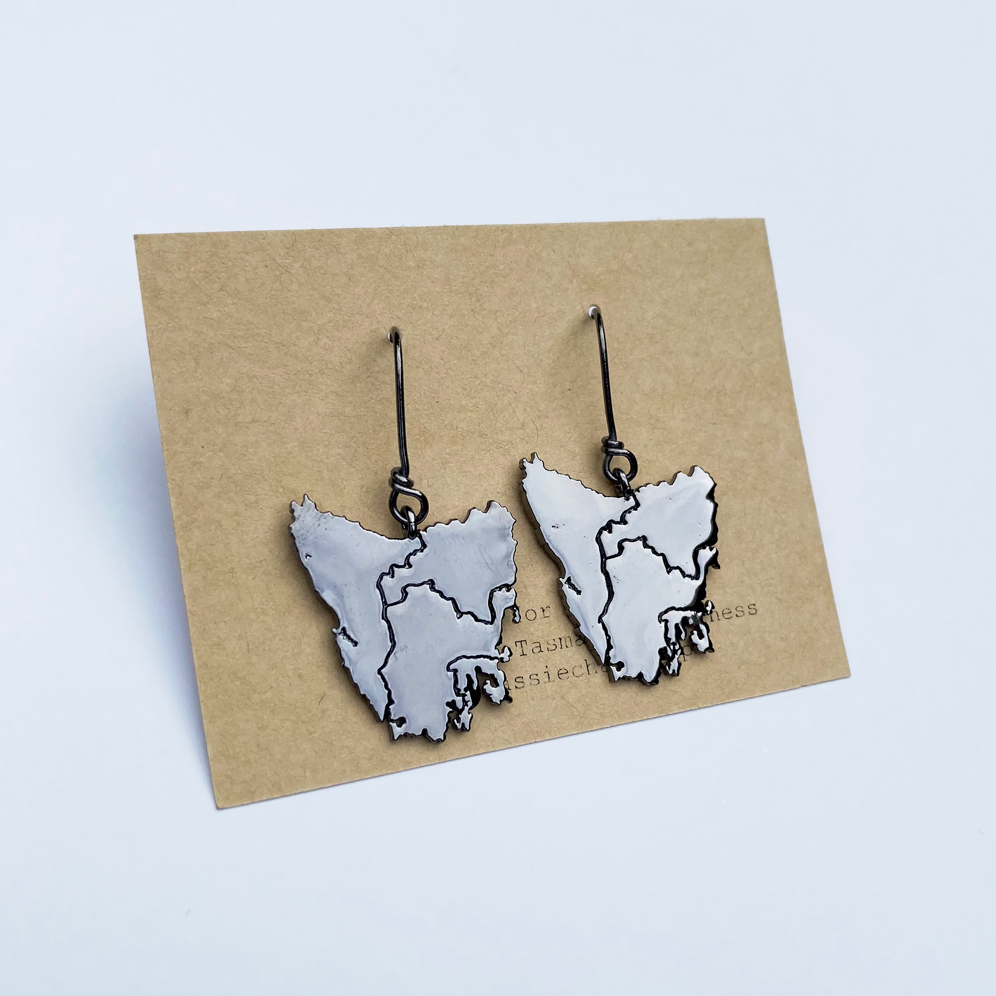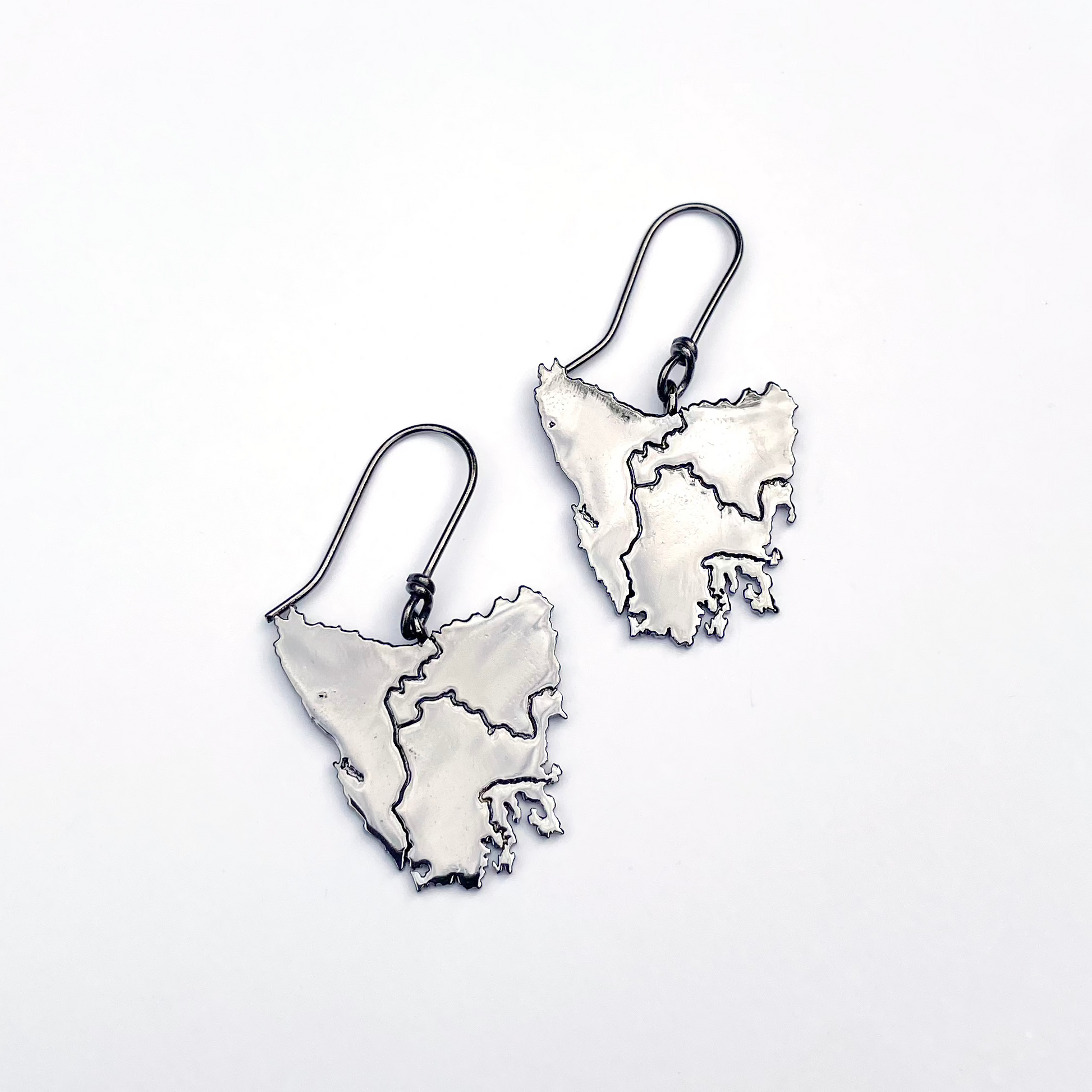 Tassie map inspired earrings in four beautiful metal plated options plus Stirling silver: