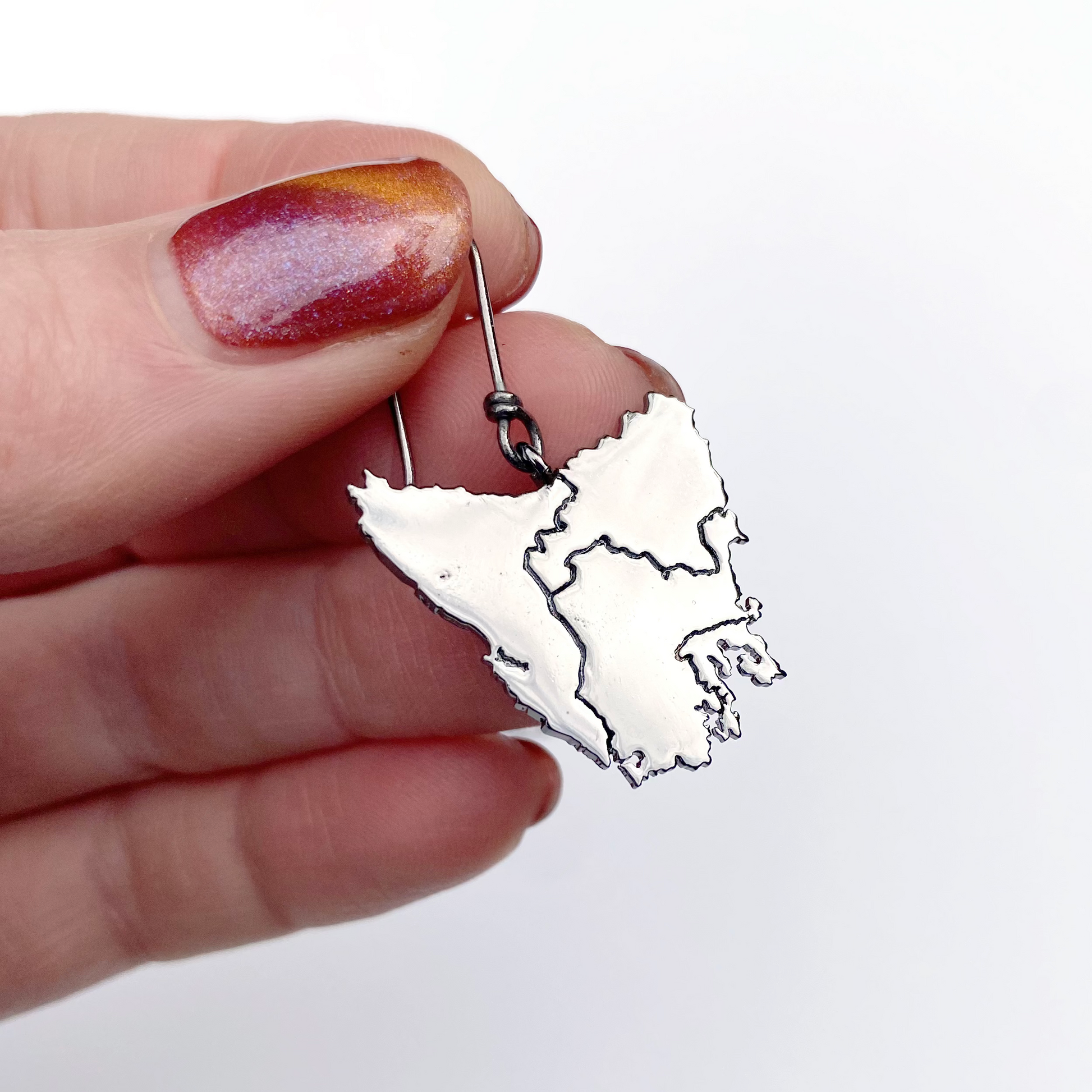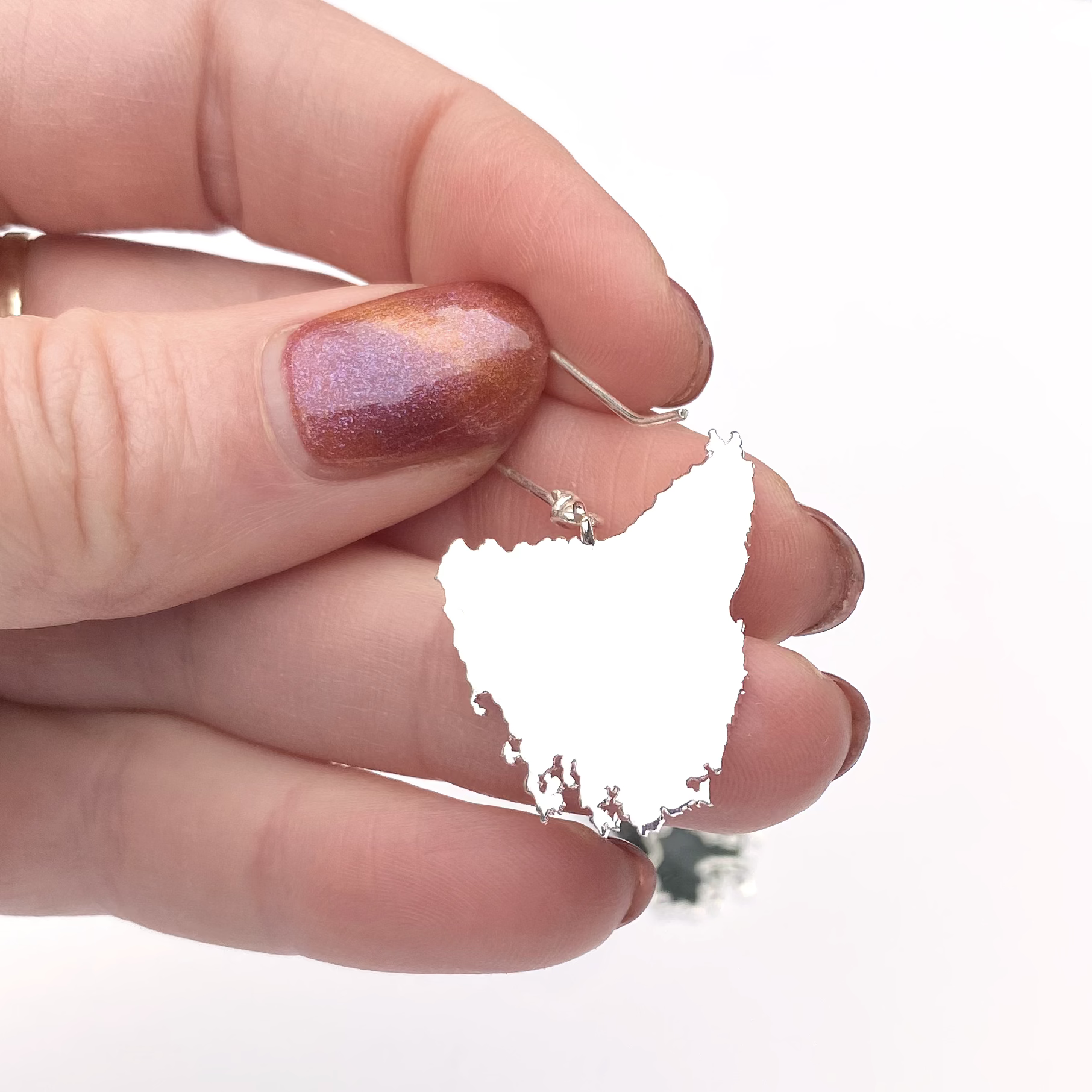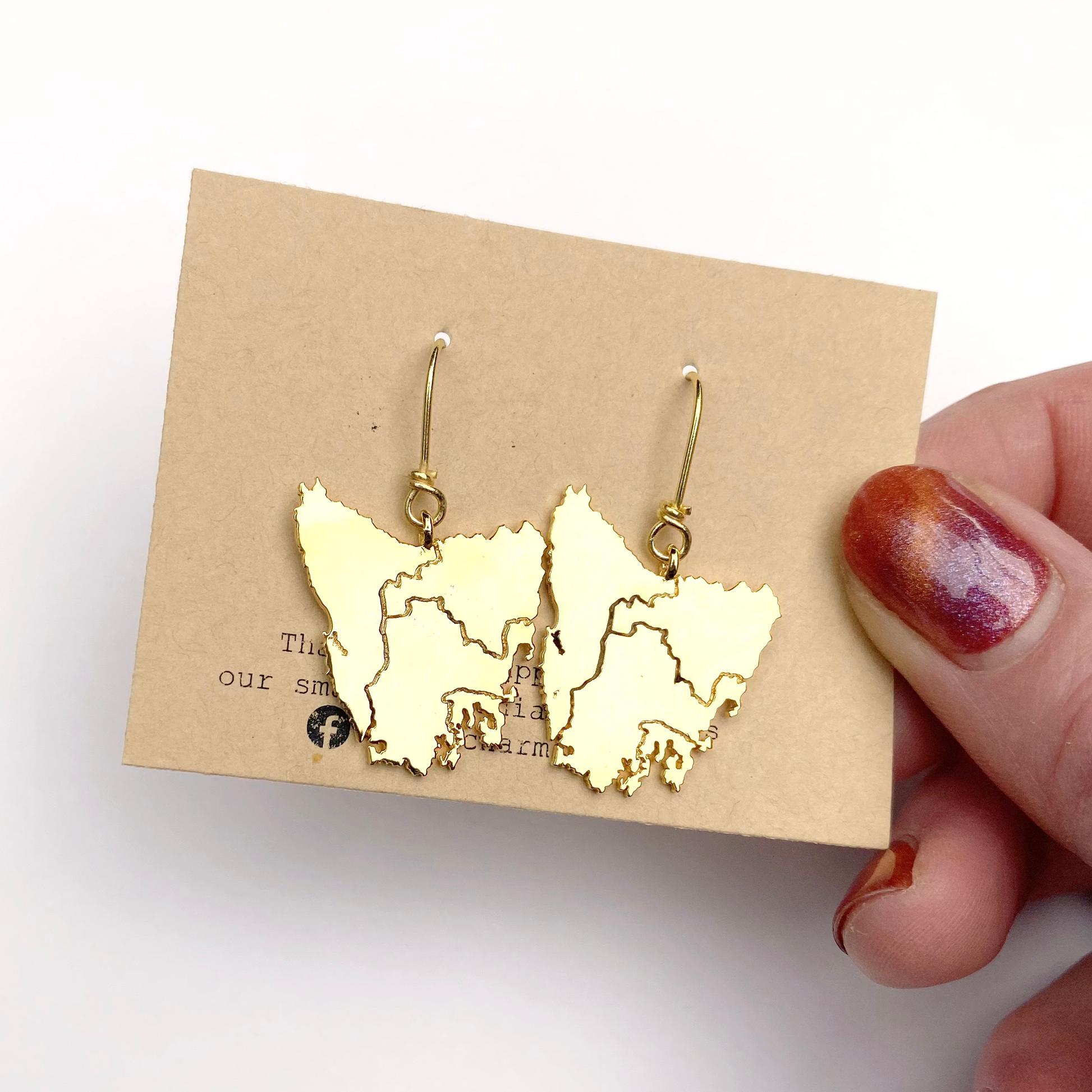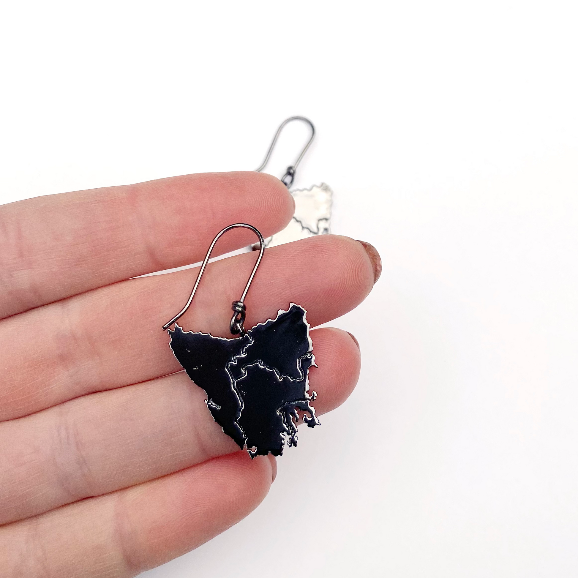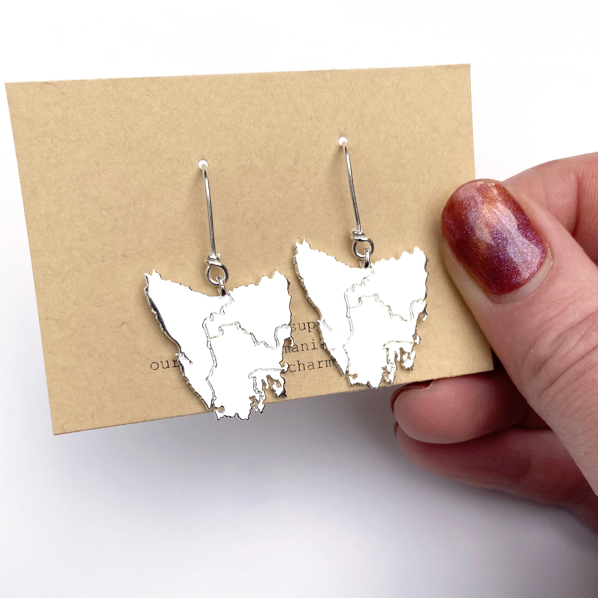 Tassie map inspired earrings in four beautiful metal plated options plus Stirling silver: